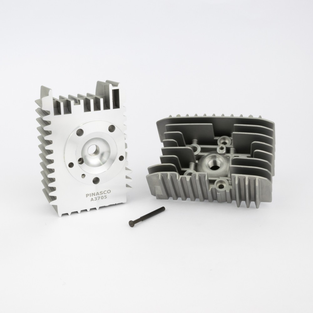 Testa di ricambio a candela centrale per gruppi termici pinasco realizzati per ciclomotori Piaggio. Può essere impiegata su motori a 3 o a 5 prigionieri.