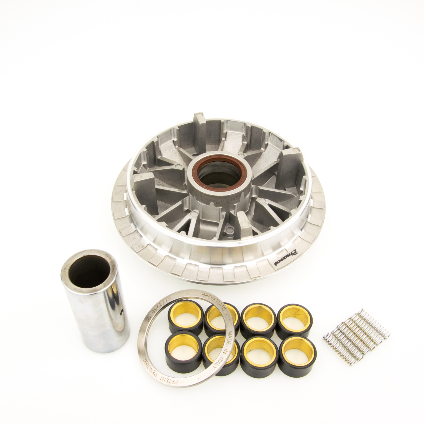 Frutto della raffinata tecnologia Pinasco, questi variatori permettono di incrementare lescursione complessiva rispetto ai componenti di serie, migliorando notevolmente la funzionalite le prestazioni degli scooter. Il kit abbinato al cuscinetto assiale Spring Slider che elimina la dannosa torsione della molla durante lescursione del variatore migliorando le prestazioni e la fluidititdi marcia. B-LOCK lesclusivo sistema di montaggio della bronzina di scorrimento mozzo variatore, principalmente sui variatori per maxi scooter, effettuato senza nessun tipo di deformazione della stessa. Con limpiego di questa tecnologia, oltre ad avere un perfetto accoppiamento senza rischi di rottura o fuoriuscita, la bronzina mantiene le sue dimensioni iniziali, garantendo costanza di prestazioni a caldo e nelluso intensivo, assicurando una durata nel tempo superiore anche a quella dei variatori originali. Applicazioni: TMax 500 i.e. 2007, TMax 500 i.e. 2008 2011.
