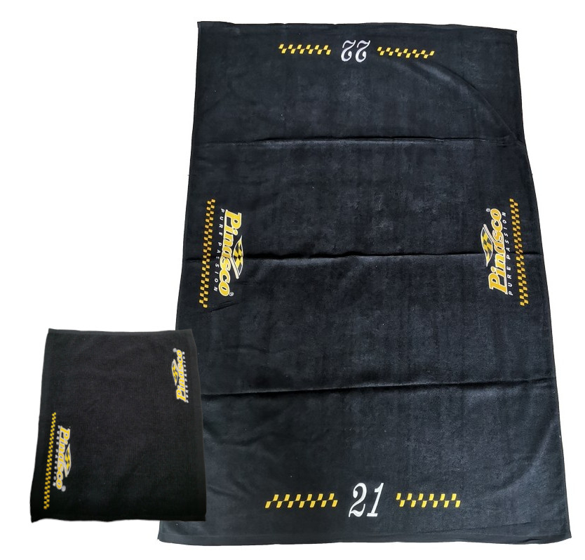 Set composto da salvietta 34x34 e Asciugamano 100x150 in spugna di cotone con loghi ricamati a spessore coi numeri ufficiali della Vespa Small 21 e Vespa Large 22 della "Scuderia Pinasco", l'accessorio ideale di chi ama il mare, la piscina e non solo.